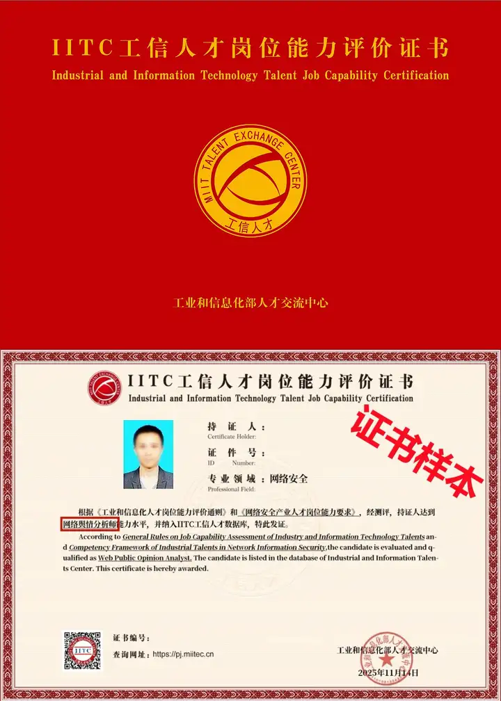 学员可自愿报名参加由工业和信息化部人才交流中心组织的《网络舆情分析师岗位能力评价》考试,考试合格者将获得IITC认证证书。该证书具备官方权威性,是岗位聘用、任职定级、职业晋升的重要依据。