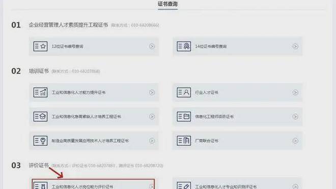2.在“证书查询”页面中,选择工业和信息化岗位能力评价证书。